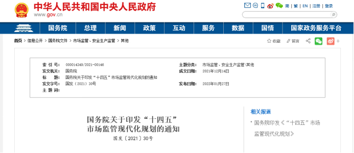 《规划》明确了“十四五”时期市场监管现代化的基本原则。提出营商环境持续优化、市场运行更加规范、市场循环充分畅通、消费安全保障有力、质量水平显著提升、监管效能全面提高等目标。
