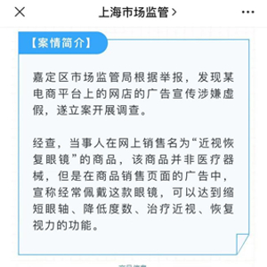 上海市场监管局微信公众号发布的文章显示,某电商平台网店销售的一款名为“近视恢复眼镜”的商品,该商品并非医疗器械,但是在商品销售页面的广告中,商家却宣称经常佩戴这款眼镜,可以达到缩短眼轴、降低度数、治疗近视、恢复视力的功能。
