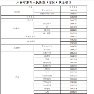六安市第四人民医院(东区)位于金安经济开发区和平南路与汉王路交叉口,已于2022年元月一日开诊,人员从市四院老院区业务骨干中抽调进驻。医院设有呼吸内科、消化内科、心血管内科、普通外科、骨科、泌尿外科、妇科、产科、儿科、康复科、中医科、麻醉科、重症医学科等临床学科和X线诊断、超声医学、医学检验、药剂科等医技科室,;医院配置国内外先进的四维彩超、64排CT、1.5T磁共振、钼靶,C型臂及全套贝克曼检验设备等大型诊疗设备。