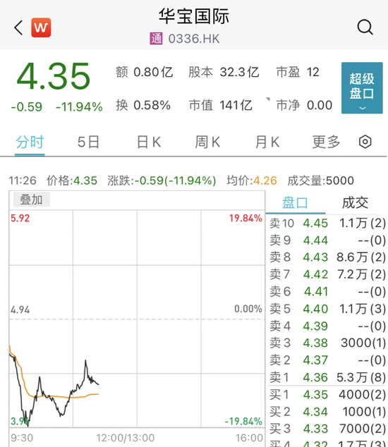 受此消息影响,今日早盘,华宝国际一度大跌近20%,华宝股份也跌近3%。截至发稿,华宝国际跌12%,报4.35港元/股,市值141亿。