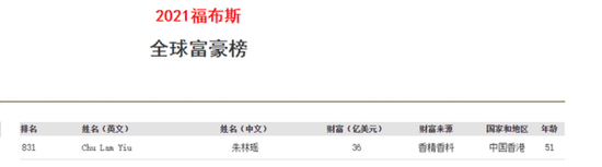 2021福布斯全球富豪榜显示,朱林瑶以36亿美元(约合人民币228亿元)财富位居全球第831名。