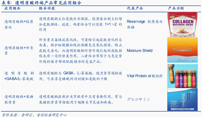 安信证券研究报告提出:玻尿酸未来有望作为食品原料搭配胶原蛋白、虾青素等成分,结合消费者喜好推出不同组合或剂型,应用于下游乳及乳制品、饮料、巧克力制品、糖果及其他功能性食品。
