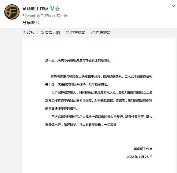 之前外界曾多次传出两人离婚的消息。黄晓明和Angelababy于2015年结婚,婚后育有一子“小海绵”。1月17日是“小海绵”5岁生日,黄晓明在在微博发文,祝儿子生日快乐。