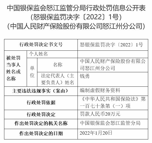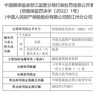 中国经济网北京1月28日讯 中国银保监会网站今日公布的中国银保监会怒江监管分局行政处罚信息公开表(怒银保监罚决字〔2022〕1号)显示,中国人民财产保险股份有限公司怒江州分公司编制虚假财务资料。中国银保监会怒江监管分局依据《中华人民共和国保险法》第一百七十条第(一)项,对其罚款人民币20万元。