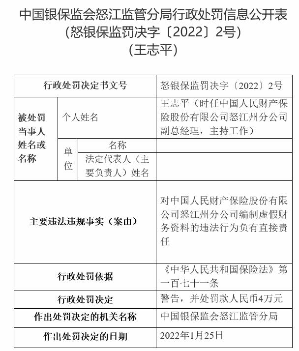 怒银保监罚决字〔2022〕2号显示,王志平(时任中国人民财产保险股份有限公司怒江州分公司副总经理,主持工作)对中国人民财产保险股份有限公司怒江州分公司编制虚假财务资料的违法行为负有直接责任。中国银保监会怒江监管分局依据《中华人民共和国保险法》第一百七十一条,对王志平警告,并处罚款人民币4万元。