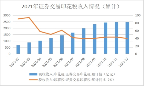 财政部此前数据显示,2021年1-11月,证券交易印花税收入为2476亿元。这意味着,2021年12月,证券交易印花税收入仅有2亿元。