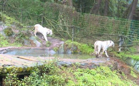 贵州森林野生动物园景区管理部总经理谭松:白虎每天的食量很大,母老虎每天吃鸡骨架和牛肉,食量大概在三公斤左右。公老虎食量更大,大约在七斤。