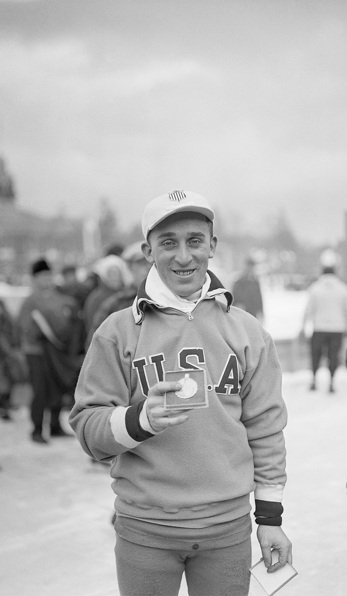 当地时间1932年2月,普莱西德湖冬奥会上,美国速度滑冰运动员欧文·贾菲展示金牌。