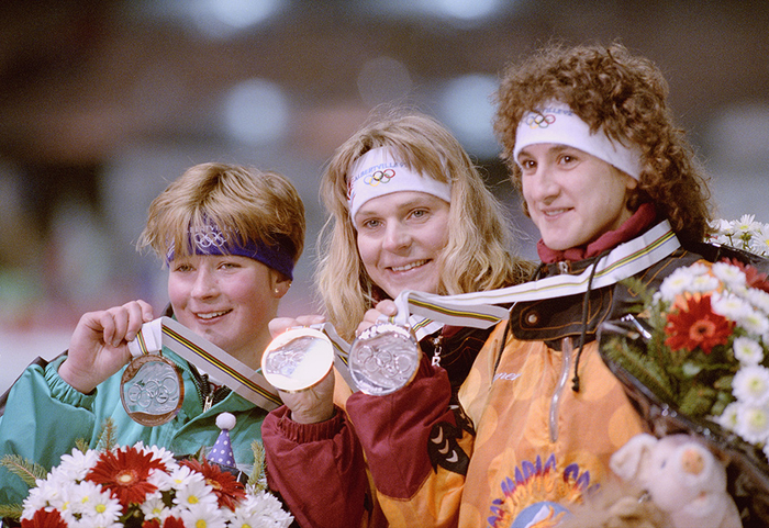 当地时间1992年2月,阿尔贝维尔冬奥会上,女子5000米速滑比赛金银铜得主在领奖台上展示奖牌。