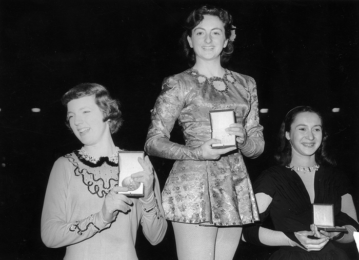 当地时间1952年2月,奥斯陆冬奥会上,英国滑冰选手珍妮特·阿尔特威格(中)获得金牌,特雷西·奥尔布赖特(左)为美国赢得银牌,杰奎琳·杜比夫为法国赢得铜牌。