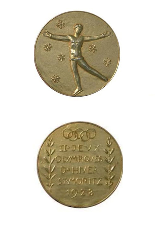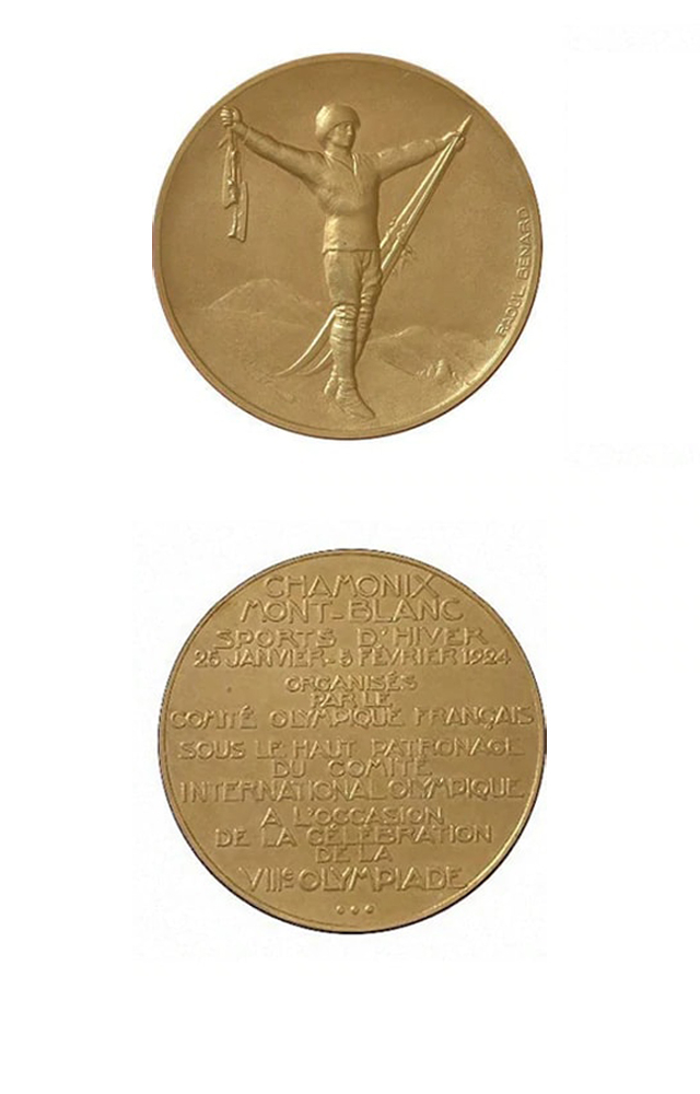 这是冬奥会史上的第一枚金牌。奖牌正面是一名张开双臂的冰雪运动员,右手提着一双溜冰鞋,左手拿着一对滑雪板,背景是阿尔卑斯山最高峰勃朗峰。