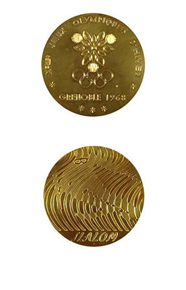 本届奥运会奖牌首次以体育项目分类。正面是由Roger Excoffon设计的官方会徽,上面写着:“XEME JEUX OLYMPIQUES D'HIVER GRENOBLE 1968”。
