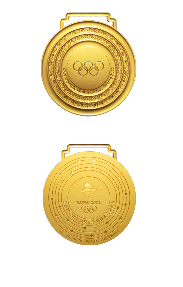 背面中心刻有北京冬奥会会徽,周围刻有“北京2022年第24届冬季奥林匹克运动会”字样。圆环上刻有24个点及运动弧线,取意古代天文图。背面最外环还镌刻获奖运动员的比赛项目名称。