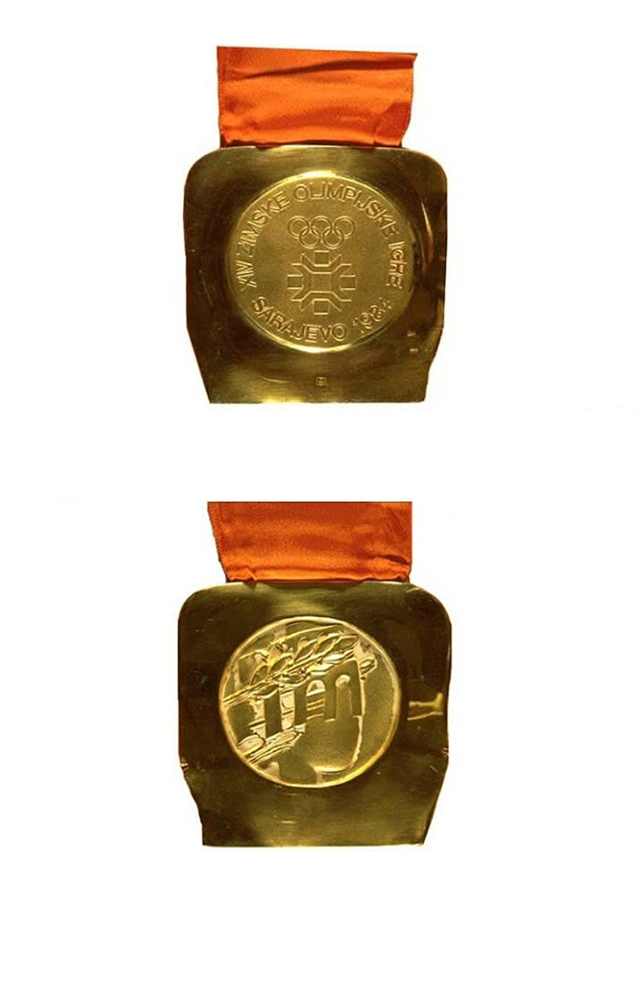 金牌正面中心刻了一片雪花和奥运五环,牌面边缘刻了“XIV Zimske Olimpijske Igre - Sarajevo 1984” 的字样。
