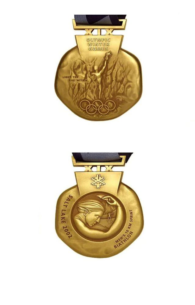 背面则是一只举着火炬的手与奥运五环重叠,伴有六片雪花装饰。奥林匹克精神“CITIUS ALTIUS FORTIUS”(更快、更高、更强)环绕奖牌边缘。