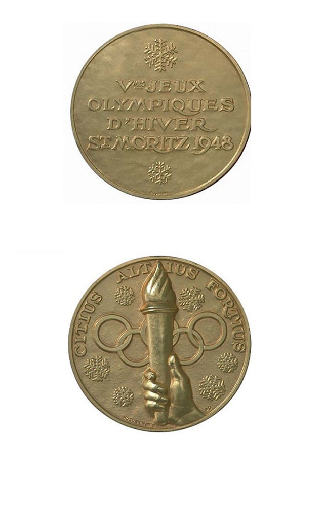 奖牌正面用两片雪花代表冬奥会的特点,牌面中心刻了该届冬奥会名称的字样“Vmes JEUX OLYMPIQUES D'HIVER ST.-MORITZ 1948”。