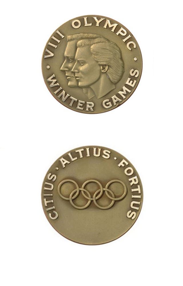 奖牌正面是两位年轻男女的头像,代表着朝气蓬勃,边缘刻有“第八届冬奥会”字样。