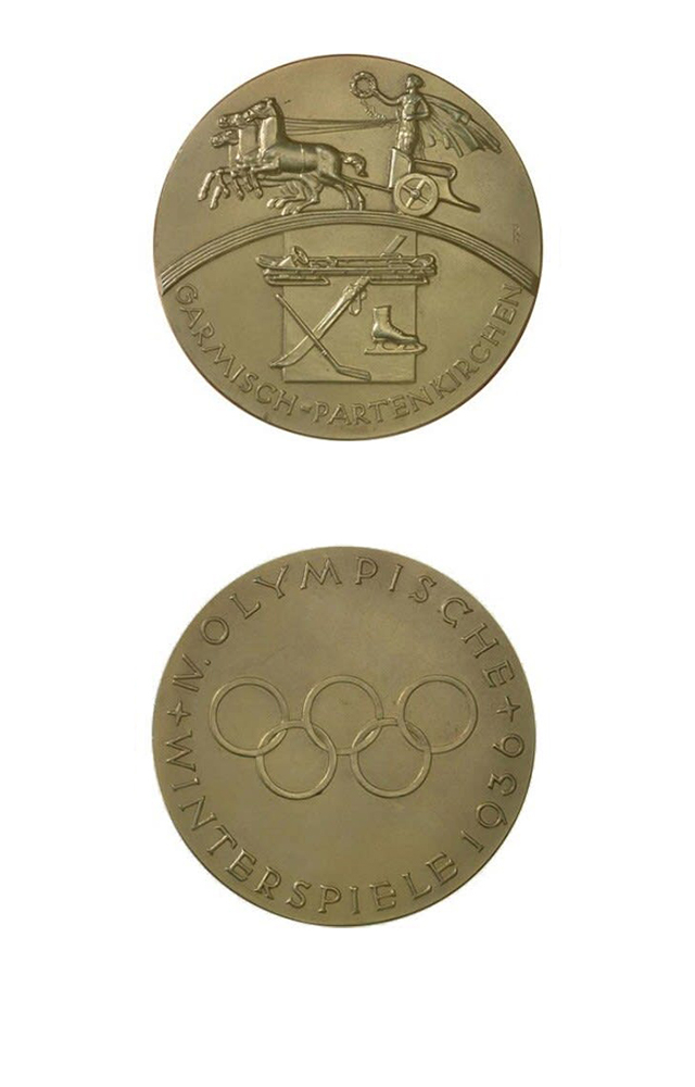 奖牌正面是胜利女神手持月桂冠驾驶一辆三驾马车,还有几个代表冬奥冰雪运动的装备插图,周围环绕的字样是:“GARMISCH-PARTENKIRCHEN”(加米施-帕滕基兴)。