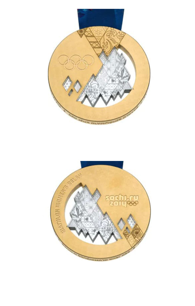 奖牌采用镂空设计,主体分为两部分,一边为体现金银铜奖牌属性的实心部分,另一边为银白色的镂空镶嵌设计,奖牌上绘有索契风光。