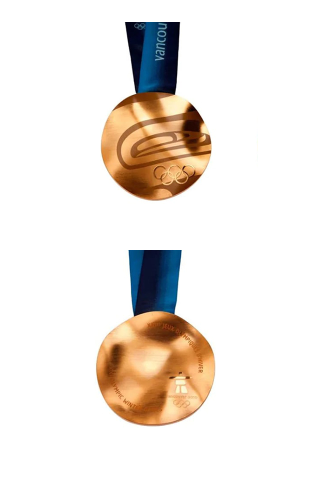 奖牌正面,奥林匹克五环以浮雕形式标出;背面印有温哥华冬奥会的字样,右下角刻上了当届冬奥会的会徽。