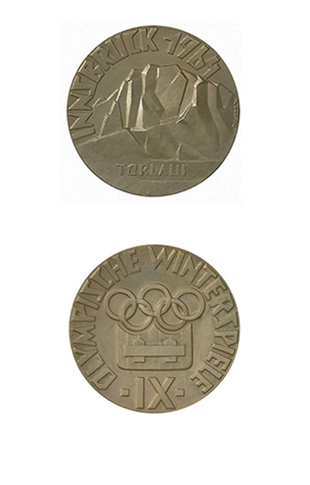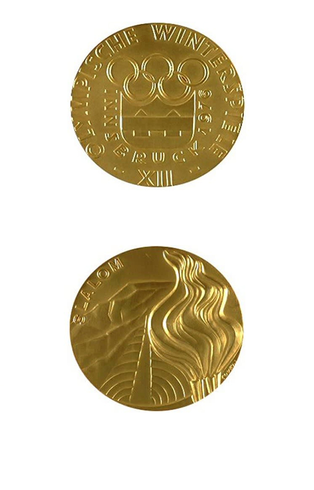 这届冬奥会奖牌上第一次刻上了竞赛项目名称。金牌正面是阿尔卑斯群山,边缘刻有“因斯布鲁克1964”。