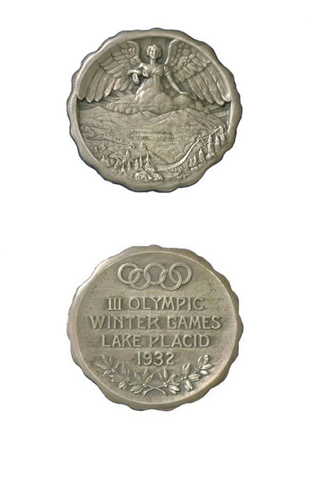 奖牌正面刻了一位在云端处插着翅膀的女神俯瞰阿迪朗达克山脚下的冬奥赛场,将冬奥会场馆、跳台滑雪场以及普莱西德湖的景色都浓缩其中,内容十分丰富。