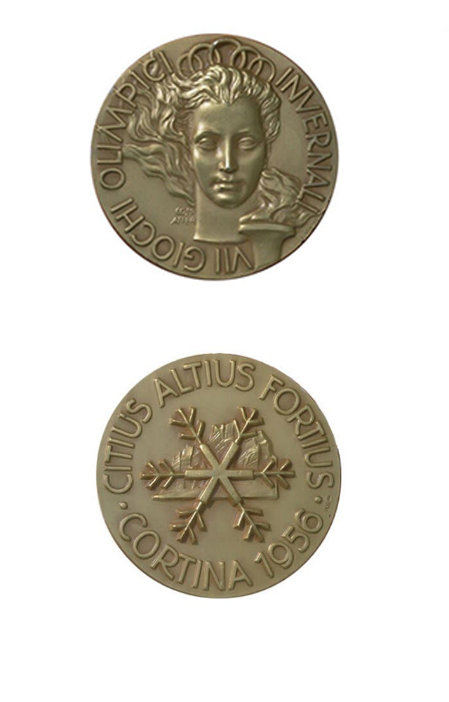 背面是一座雪山代表了冬奥会的特征,环绕在奖牌边缘的字样写着:“CITIUS ALTIUS FORTIUS - CORTINA 1956”。
