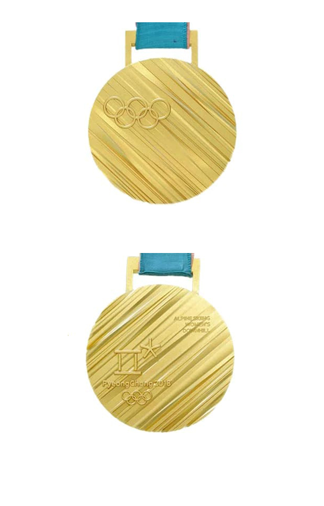 奖牌采用了立体条纹图案,奖牌正面左上方是奥运五环的标志,背面印有奥运标志和具体运动赛事名称。侧面刻上“平昌冬季奥运会2018”的韩文子音和母音,凸显立体感。