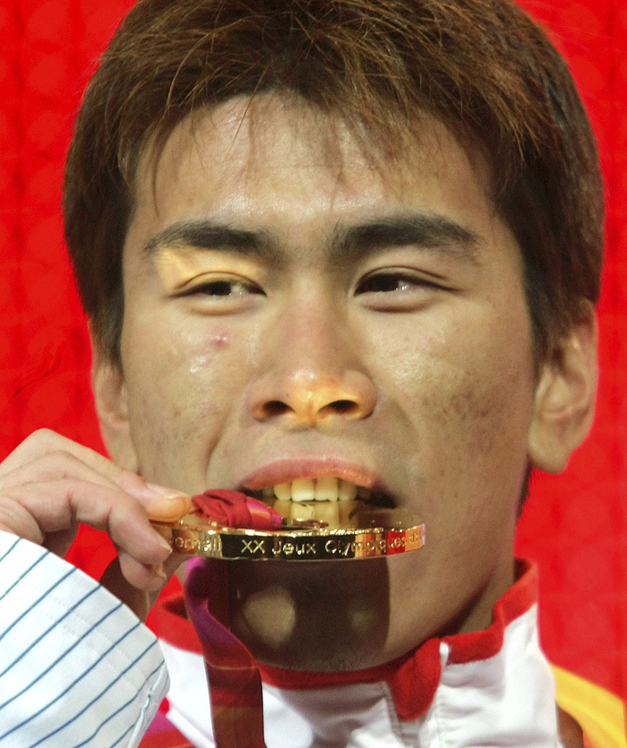 当地时间2006年2月,都灵冬奥会自由式滑雪男子空中技巧颁奖仪式,中国选手韩晓鹏展示金牌。