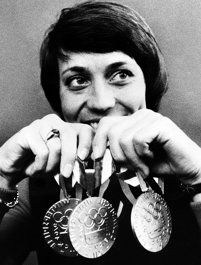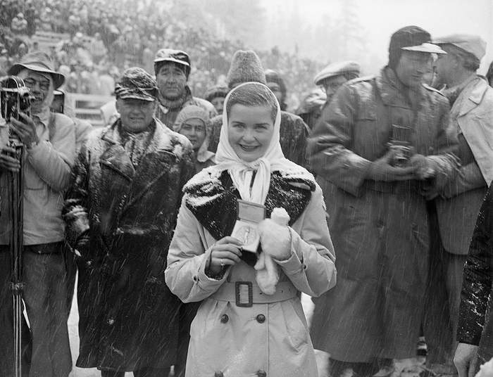 当地时间1964年2月10日,因斯布鲁克冬奥会上,苏联运动员博亚尔斯基赫展示三块金牌。她在本届奥运会夺得越野滑雪女子3×5公里接力、5公里、10公里三项冠军。