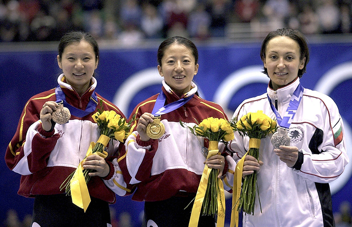 当地时间2002年2月16日,盐湖城冬奥会短道速滑女子500米颁奖仪式,杨扬获金牌,王春露获铜牌,保加利亚选手拉达诺娃获银牌,这是中国代表团冬奥会历史的首枚金牌。