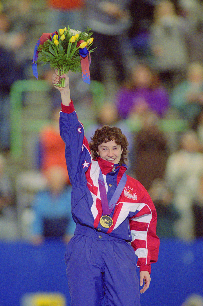 当地时间1994年2月,利勒哈默尔冬奥会上,来自美国的女子速度滑冰1000米冠军邦妮布莱尔戴上金牌庆祝。