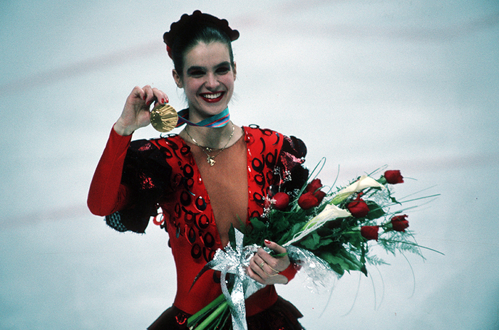 当地时间1988年2月,卡尔加里冬奥会上,德国花样滑冰选手卡特琳娜·维特展示她的金牌。