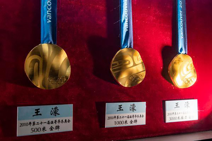 2022年1月8日,在七台河短道速滑冠军馆内拍摄的王濛在2010年温哥华冬奥会上获得的三枚金牌。
