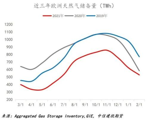欧洲国家通常在每年气温偏暖的时候(5-10月),进行天然气的储备。因为欧美天然气的消费结构大致是住宅和发电,随着气温的降低(11月-次年3月),天然气的需求和消耗也越来越高,也会随之消耗天然气库存。