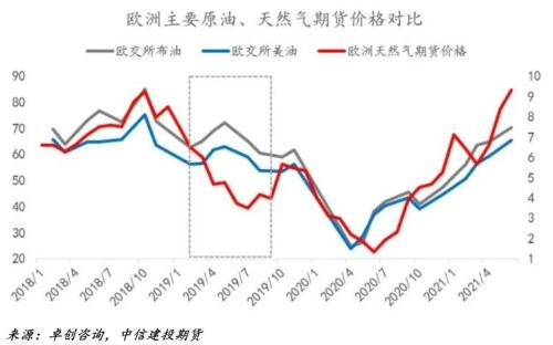 在2021年天然气气荒之前,天然气价格与原油价格高度相关。除2019年初天然气价格骤降与石油价格不协调以外(上图虚线框部分),其余大部分时间天然气期货价格与原油期货价格高度正相关。