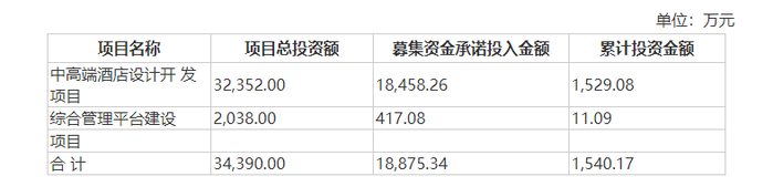 2021年9月30日,君亭酒店成功在创业板上市,公司主要从事于中高端精选服务连锁酒店的运营及管理。上市时,君亭酒店预计募资3.44亿元,其中“中高端酒店设计开发项目”拟使用3.24亿元,剩余2038万元投入到“综合管理平台建设项目”。不过,君亭酒店本次发行募集资金总额为2.46亿元,扣除发行费用5769.90万元(不含税),实际募集资金净额为1.89亿元。截至去年底,君亭酒店中高端酒店设计开发项目累计投资金额达1529.08万元,综合管理平台建设项目达11.09万元。