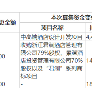 值得一提的是,此次君亭酒店用于收购的1.4亿元资金来自于公司拟将投入到中高端酒店设计开发项目的1.85亿元募资,变更额度占实际募资金额约74%。