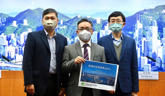 环境保护署(环保署)1月28日公布2021年香港的空气质素概况,显示本港的整体空气质素在持续改善。环保署助理署长(空气质素政策)梁启明博士(中)、环保署首席环境保护主任(空气科学)刘万鹏(左)及环保署高级环境保护主任(空气科学)李裕韬(右)在简报会开始前合照。