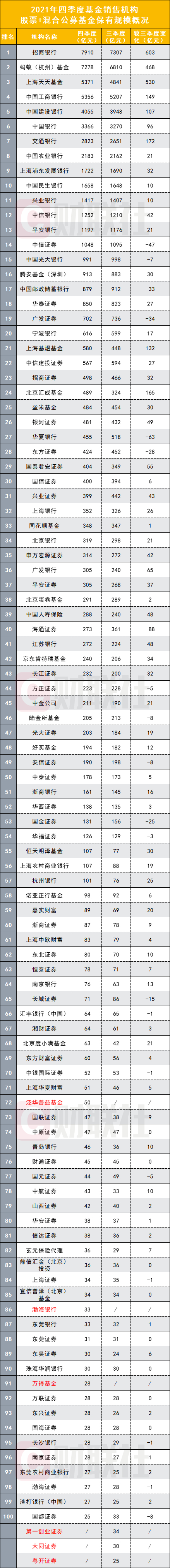 跟随其后的是蚂蚁基金、天天基金、工商银行、建设银行,其2021年四季度权益基金销售保有规模依次为7278亿元、5371亿元、5356亿元、4055亿元。