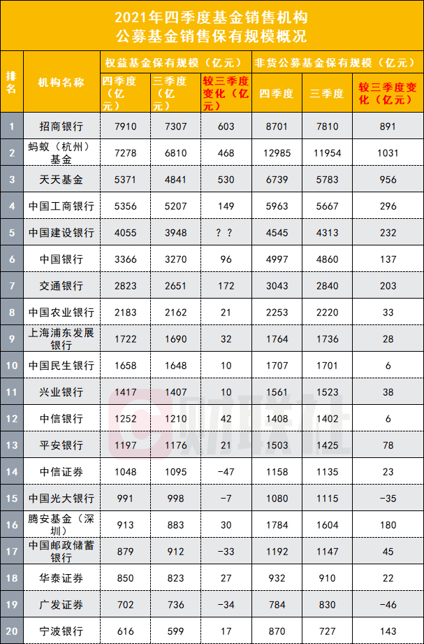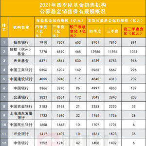权益基金销售保有量方面,招商银行继续居首,达到7910亿元,但相较于2021年2021年四季度增加了603亿元。蚂蚁基金2021年四季度权益基金保有规模较2021年2021年四季度也增长了468亿元,至7278亿元。同期,天天基金在2021年四季度以530亿元的增量跻身权益基金销售保有规模榜单前三。