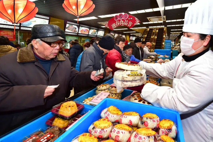 上海市民置办年货,各家老字号出品的八宝饭是必选项