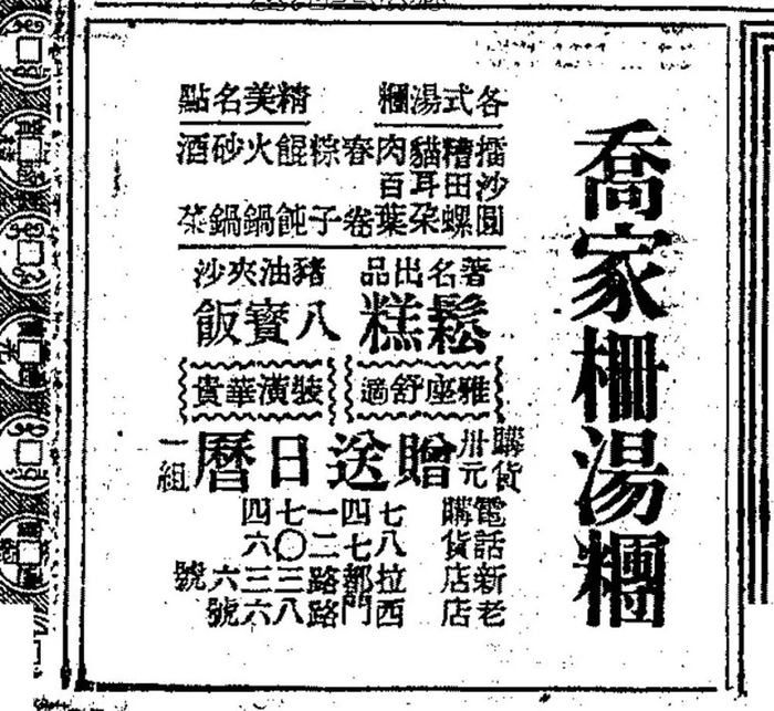 1942年12月24日《申报》刊发乔家栅广告中的“猪油夹沙八宝饭”
