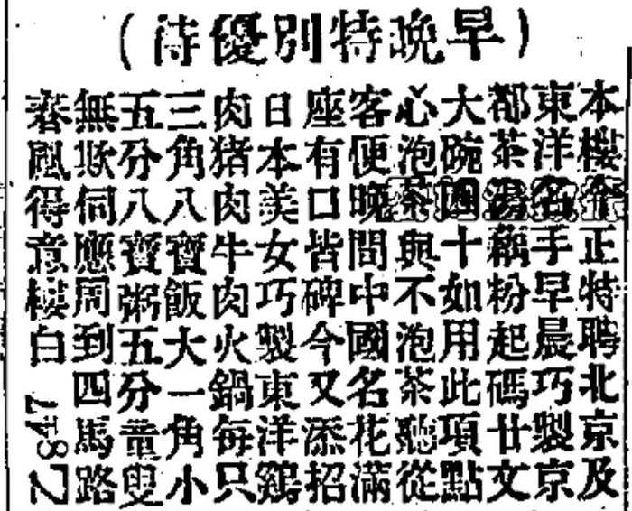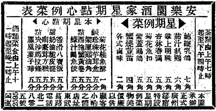 开设上海二马路石路西大新街口,镜中天照相楼隔壁,新式洋台红砖大石库墙门内, 一切细章程载在游戏报上,阅者鉴之,改良卫生香茗,特别美味小酌,谨择于十二月十四吉日开张……凡来本集游玩,并不收取游资,改良香茗每壶钱五十,手巾小账一概不取,特别美味小酌每客小洋五角,二荤盆二热炒一汤,点心八宝饭杏仁茶每客小洋一角,虾仁春卷一品馒头每件小洋二分……