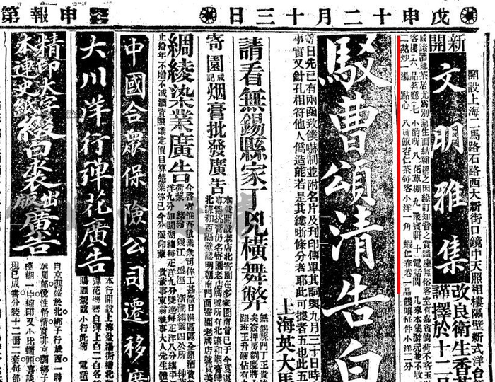 近代以来的上海,随着各地人士的汇聚以及城市化进程的推动,诸多风俗和饮食习惯也在不断变化之中。八宝饭由于其被接受的广泛程度,也渐渐地从岁时食物向大众点心转变。我们可以在19世纪末之后的沪上各大报刊广告中找到八宝饭的身影,当时已是许多茶楼、食肆日常供应的品种。如1909年1月4日《申报》刊发的这则“新開文明雅集”告示: