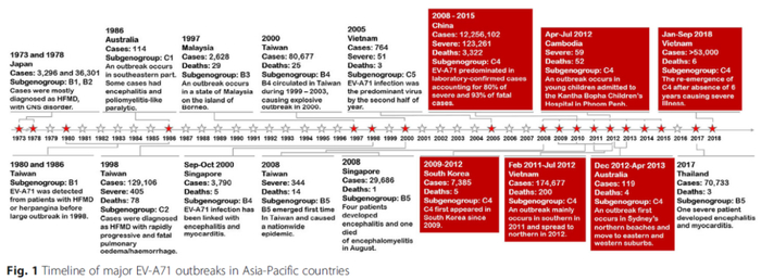 据悉,近20年来,手足口病在亚太地区广泛流行,包括马来西亚、中国台湾、日本、新加坡、越南等地都有不同程度的暴发与流行,并呈发病率高、流行范围广、重症和病死人数增多的流行特征。EV71相关手足口病已在亚太地区多个国家或地区长期流行,成为重要的公共卫生问题。自2001年泰国卫生部通过医院开展手足口病监测以来,2001年至2018年间,共报告502329例病例,其中EV71是常见的病毒之一,对当地儿童的生命健康造成极大的威胁。
