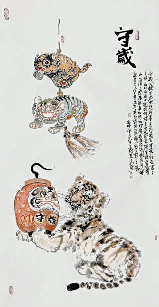 据记载,古时新春民间很多地方都会张贴门神、悬挂虎图,或在桃木板上画虎头,以祈求福佑禳灾。到了端午节,除去吃粽子、赛龙舟,讲究一些的人家还要用雄黄酒在孩子的额头上画“虎头纹”写“王”字,把艾叶装饰成老虎的形状,作为配饰。种种借虎辟邪祛秽的习俗,反映出先民对美好生活的向往、对阳刚之气的推崇、对尚武精神的美化。想来那时的民风深受官方说法的影响,如帝王授予臣子兵权和调遣军队的信物叫“虎符”,善战的军队叫“虎旅”,将帅的营房叫“虎帐”,英勇的统领叫“虎将”,保卫国君及王宫、王门的官员叫“虎贲”,守卫帝王或国门的勇士叫“虎卫”,遮护城邑或营寨的竹篱叫“虎落”,因时制宜、革新创制叫“虎变”,连文质彬彬的读书人进士及第都叫登“龙虎榜”……借虎威以壮形色,虎躯、虎视、虎行、虎步、虎怒,哪怕躺平了都可以叫“虎卧”!从君王到民众、从军国大事到个人举止,辞藻如云,不一而足。