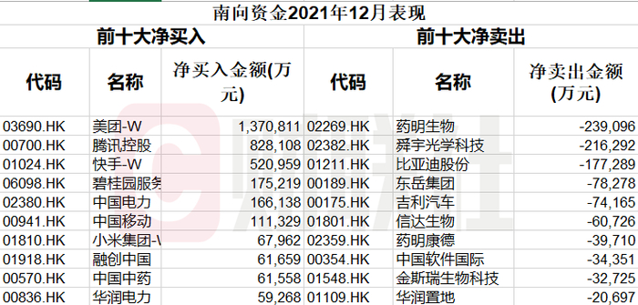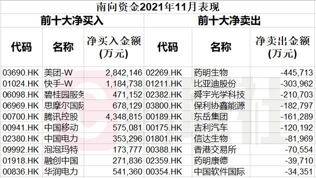 而2021年12月份亦是相同的“配方”,美团、腾讯控股、快手仍是南向资金最爱个股的前三名,分别被买入137.08亿元、82.81亿元、52.09亿元。只是在2021年11月份,“配方”略有变动,美团、快手、碧桂园服务分别被买入284亿元、118.4亿元、471.152亿元,位列前三。