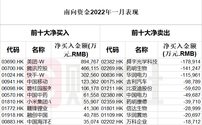 根据数据统计,美团、腾讯控股、快手在今年1月分别以89.47亿元、46.61亿元、30.25亿元的买入量位列榜首。
