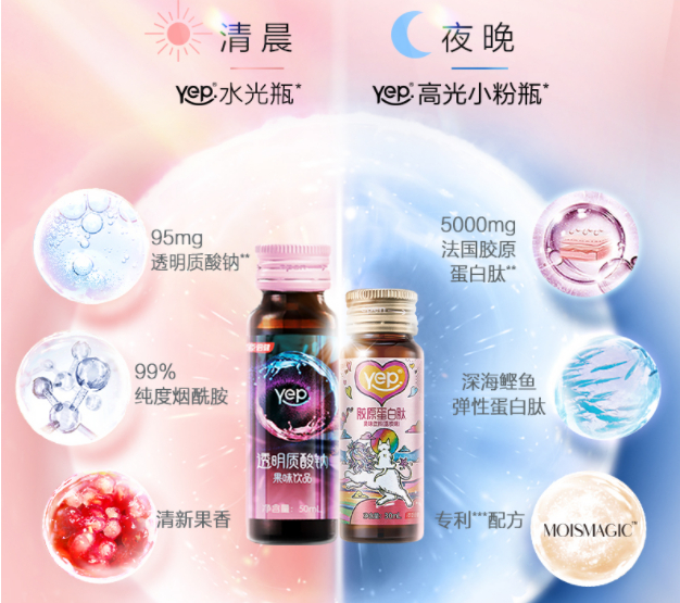 “营养美学”大行其道下,年轻人当下精于“肌肤营养”的喜好如何拿捏?对此,市场拓新者颇多,汤臣倍健旗下子品牌Yep以“早玻晚胶”生活方式(早上服用玻尿酸,晚上服用胶原蛋白)理念切入,快速出圈,成为口服美容亲睐者的宠儿。